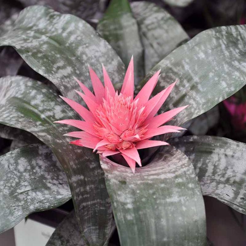 A stunning bromeliad featuring silver-green leaves with a frosty sheen and a striking pink flower bract that lasts for months. This low-maintenance houseplant adds a bold, tropical accent to bright indoor spaces.