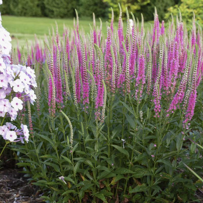 'Perfectly Picasso' produces paintbrush-like spikes of white buds that will open to medium pink flowers that cover the top half of the plant. The contrast between the buds and the flowers give this plant a unique bicolor look.