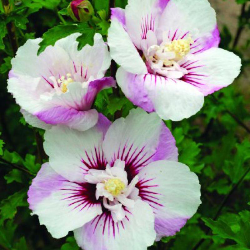 The color and texture of this variety will bring to mind beautiful exotic islands. Its buds are medium pink and give way to semi-double flowers which slowly fade to light pink with a splash of deep red in the center. It blooms from late July to September.