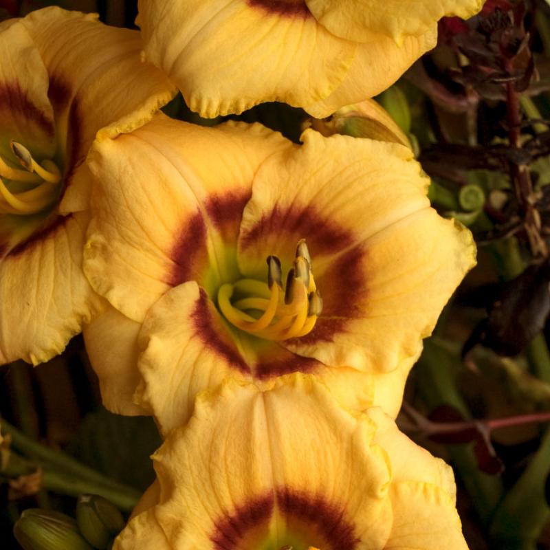 'Baby Moon Cafe' features fragrant, soft butter-yellow 3" flowers with a deep purple eye that are carried on plants with an exceptionally high bud count. The blooms appear in early to mid-season and then repeat.