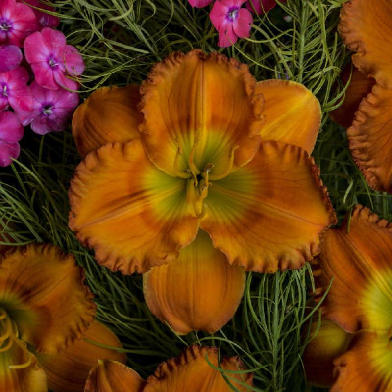 One of the first daylilies to bloom in early July, the large 5" light orange flowers of this variety have deep orange eyezones and yellow green throats that are further accented by heavily ruffled petal edges.