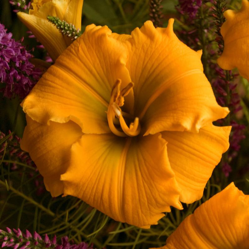 Shining golden orange 4" flowers are produced on heavily budded stems in mid-late summer on this repeat bloomer.