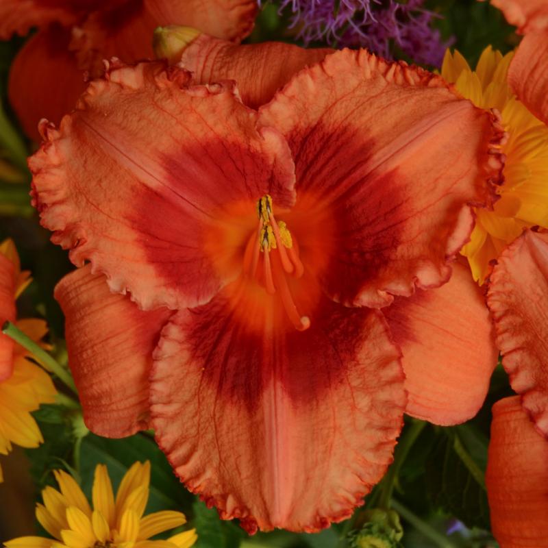Ruffled coral-orange 5" blooms with a scarlet eyezone, pink undertones and a orange throat adorn this compact plant during mid-season.