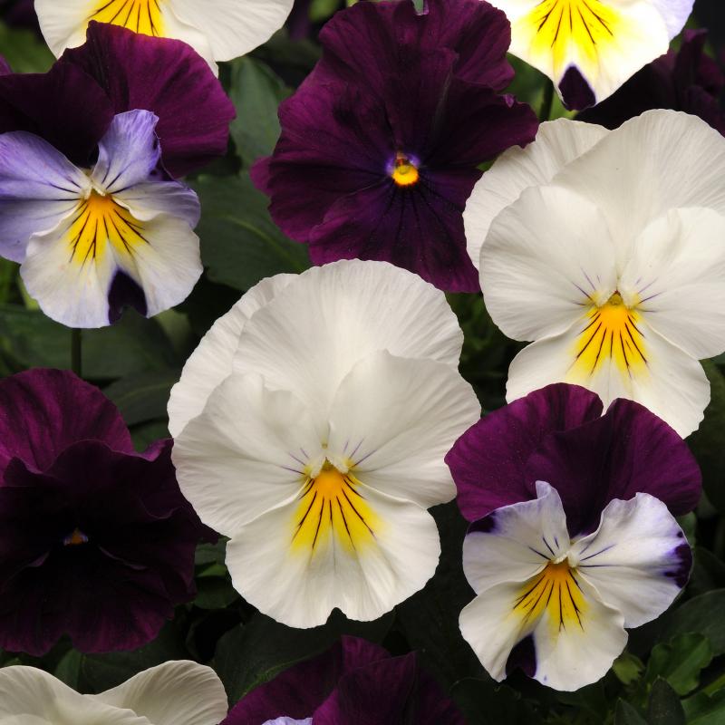 A unique trailing to cascading variety that is very hardy and vigorous. Plants are covered in masses of fragrant multi-colored pansies of purple, violet and white bi and tri-colors all with cheery yellow centers!