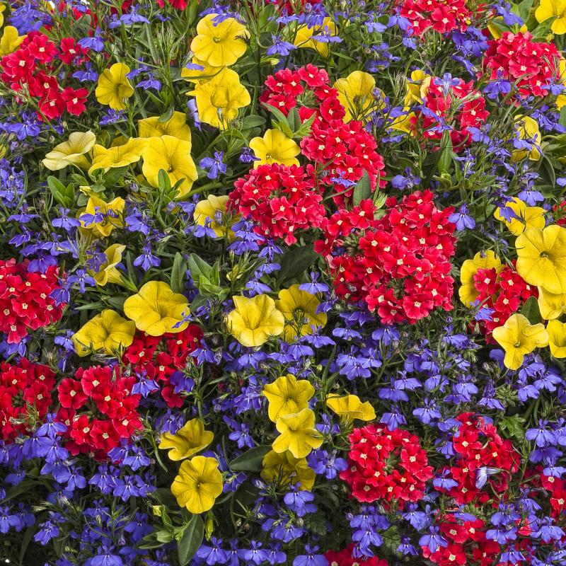 Add instant color to a deck, porch or patio with our combination hanging baskets and patio pots. Each combination brings together several colorful varieties of annuals into a group that packs a punch of intense color.
