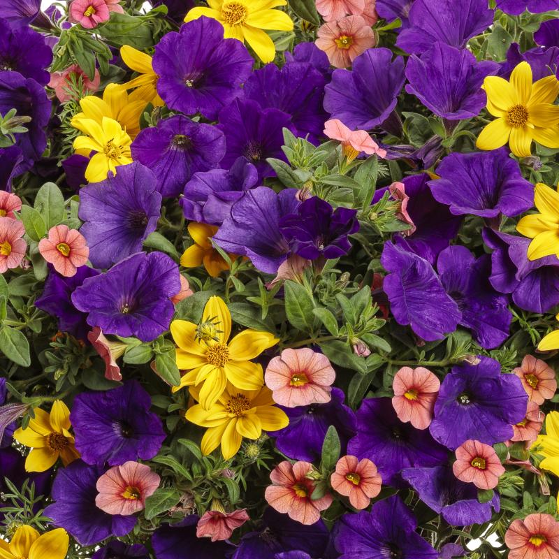 Add instant color to a deck, porch or patio with our combination hanging baskets and patio pots. Each combination brings together several colorful varieties of annuals into a group that packs a punch of intense color.