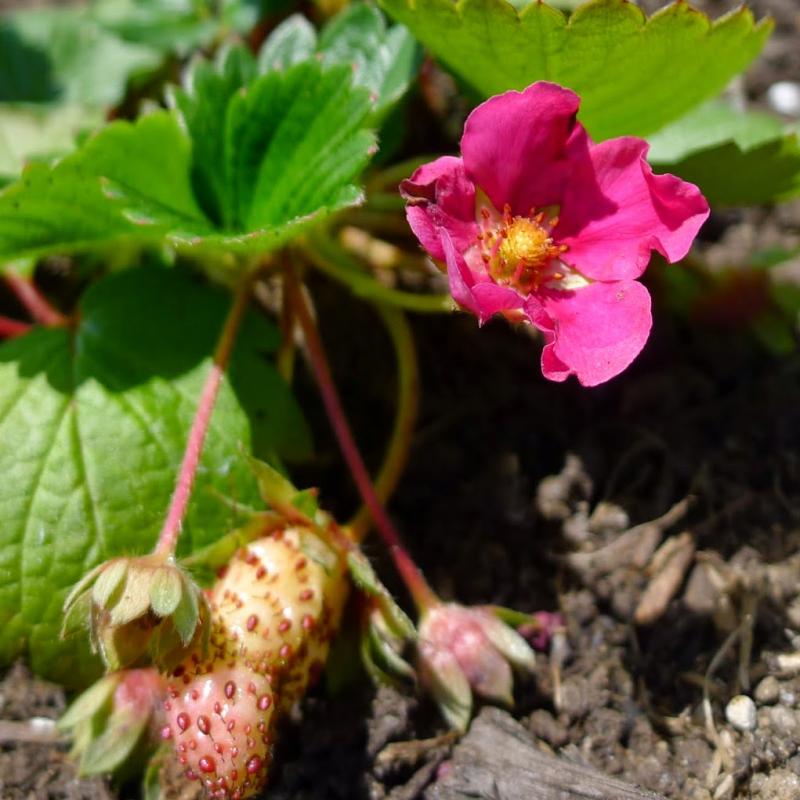 The perfect strawberry for patios, porches, or decks, this lovely rose-flowered variety sets large, luscious red berries from June until frost.
