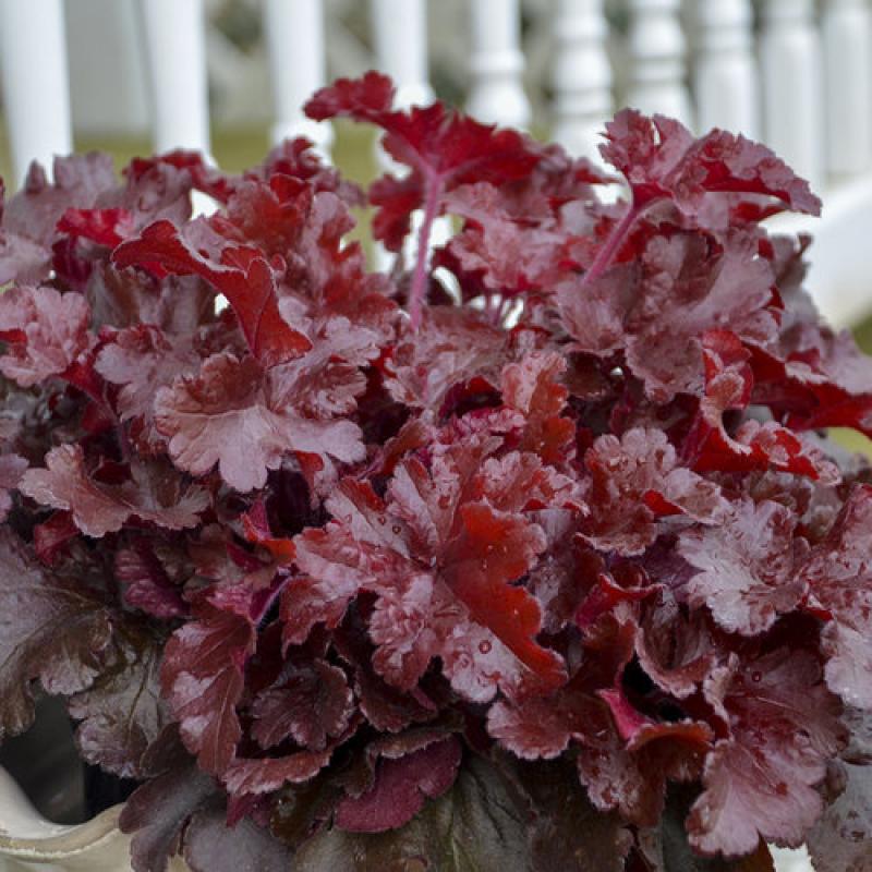 This variety's new leaves are bright red, heavily ruffled and form a low, mounding habit. In summer, the bright color persists before maturing to a rich mahogany red. Dark burgundy stems will hold light pink flowers from early to midsummer.