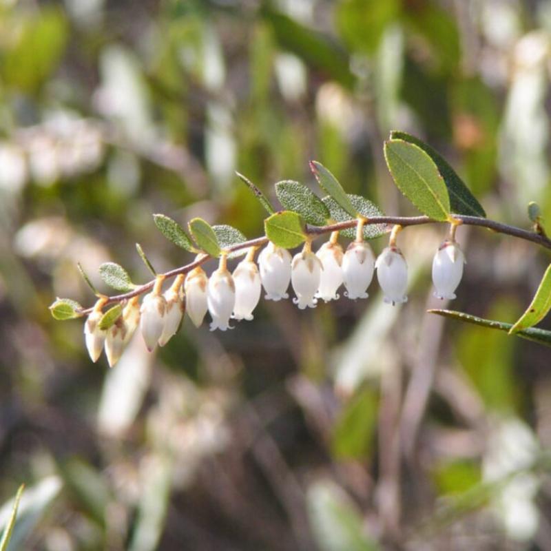 ‘Dew Drop’ is a hardy native shrub prized for its small, bell-shaped white flowers that dangle gracefully along arching stems in spring. Its leathery, evergreen foliage provides year-round interest, and it thrives in wet, acidic soils, making it ideal for naturalized or bog gardens.