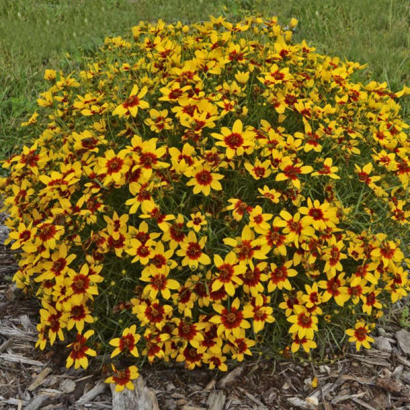 This Coreopsis will catch your eye from a distance thanks to 1.5" wide, golden yellow flowers with clear, dark red eyes and wide petals.