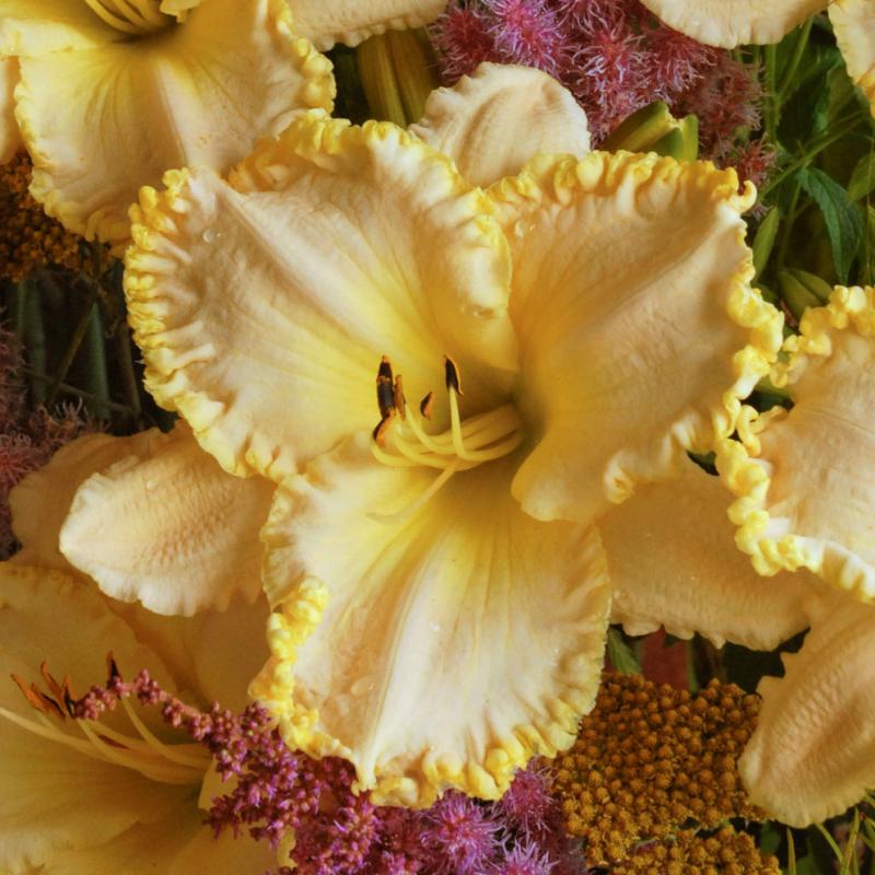 Wow! 5.5" fragrant, creamy white heavily ruffled flowers overcast yellow with yellow throats appear on this heavy mid-late season bloomer.