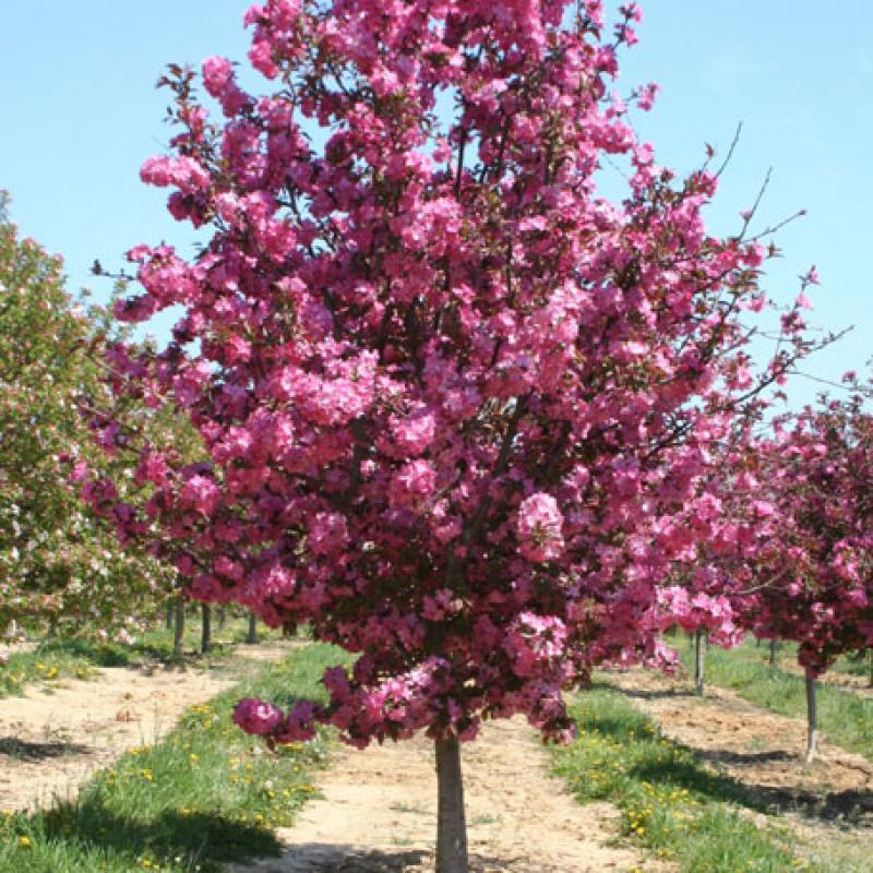 A broad spreading variety that erupts with deep pink flowers in April followed by deep red new growth that lightens to green-red as it matures. Dark red persistent fruit in the fall extends the interest.