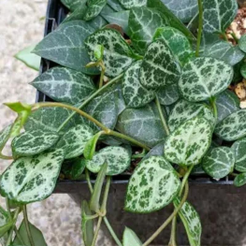 This elegant trailing plant exhibits interesting spade-shaped leaves with purple undertones and light green vienation. This plant would do well in a hanging basket to best display its stems.