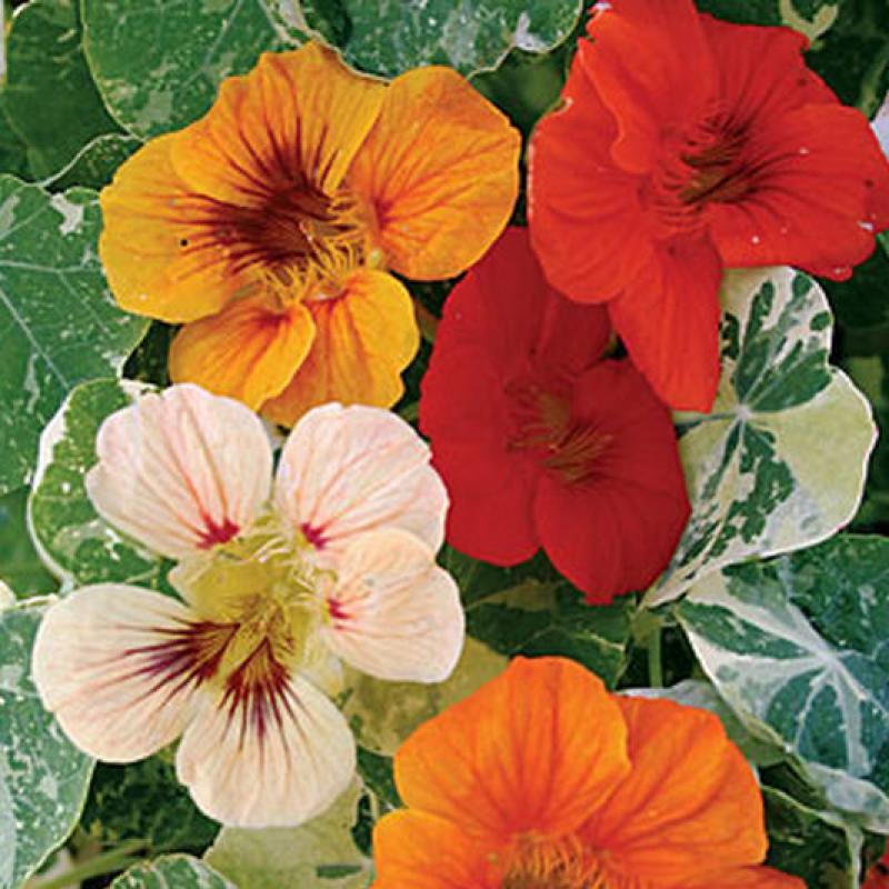 Alaska Mix' will produce a collection of gold, orange, salmon and mahogany flowers on compact plants with attractive variegated foliage. The flowers and tender young leaves will add color and a peppery zip to salads.