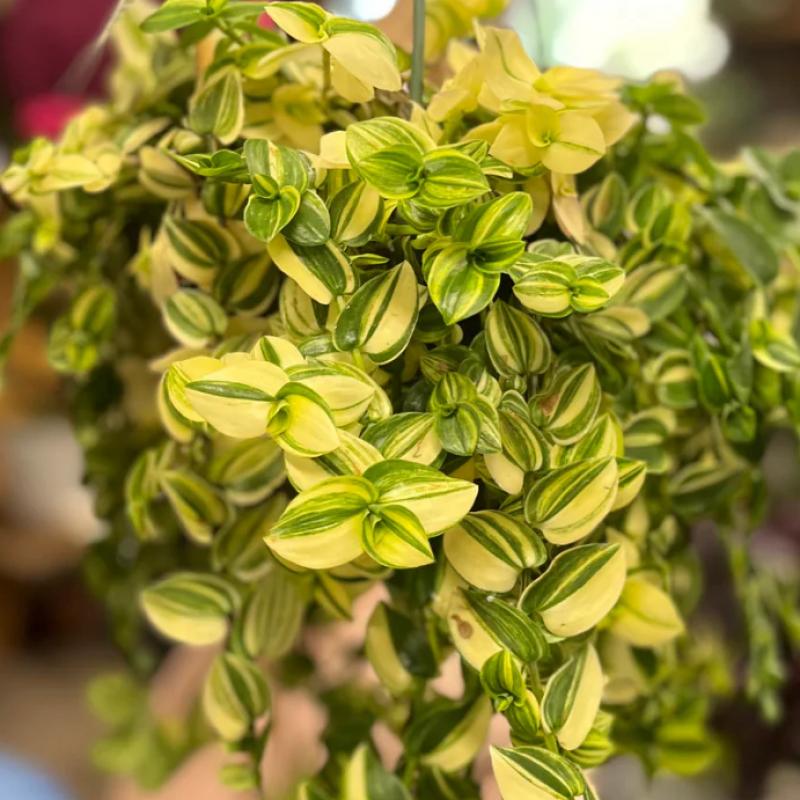 A dazzling trailing plant with bright golden-yellow and green striped foliage. Tradescantia 'Yellow Zebra' brings instant warmth and texture to any room. Its cascading habit makes it ideal for hanging baskets or high shelves where its vibrant leaves can shine.