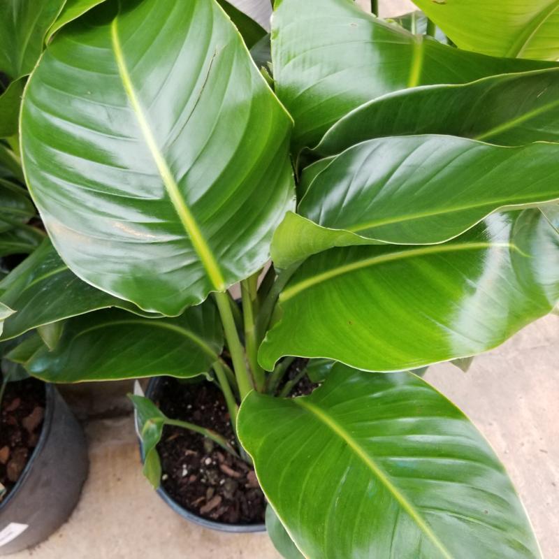 A bold and architectural tropical plant with large, glossy banana-like leaves arranged in a fan-like shape. This statement houseplant brings a lush, exotic feel to indoor spaces and can reach impressive heights in the right conditions. It may produce white and blue bird-like flowers in mature specimens.