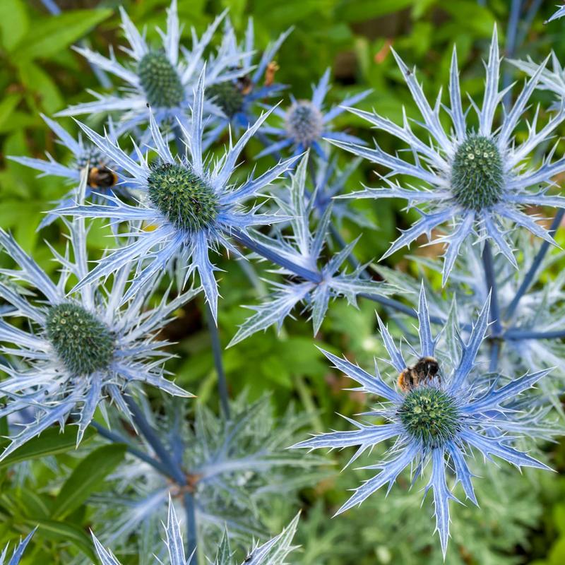 The iridescent, cobalt blue flowers of 'Big Blue' are held on blue stems and contrast beautifully with the spiky silvery foliage.