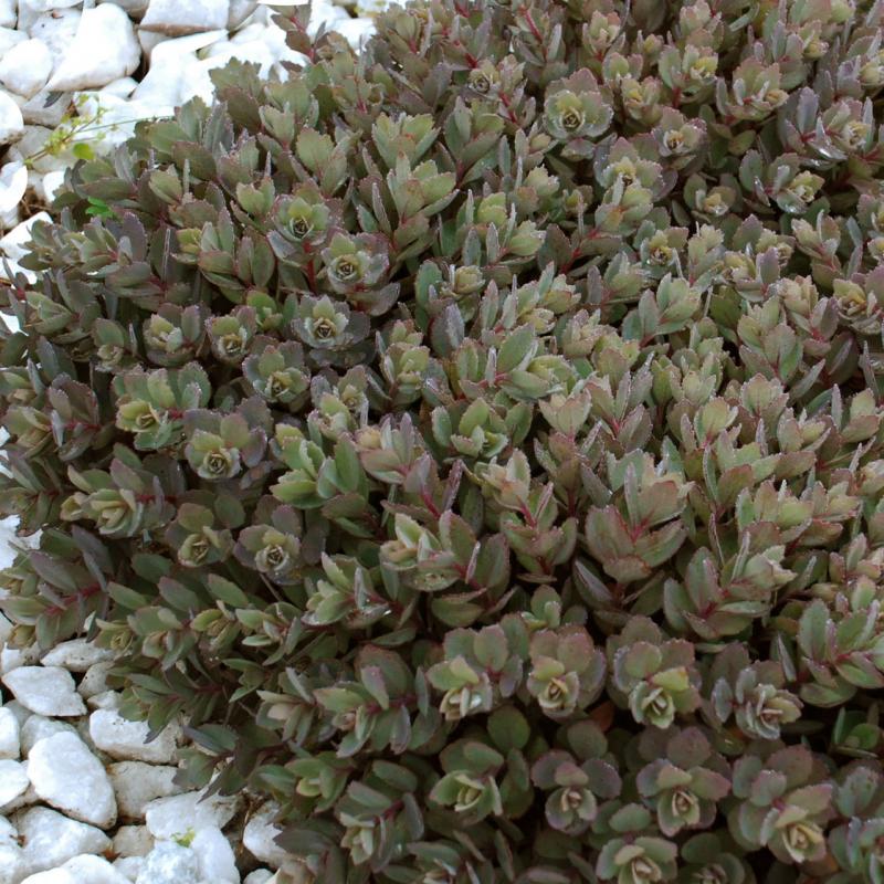 The smoky blue-gray foliage of this variety forms low mats covered with very large raspberry-colored flower clusters in late summer and early fall.