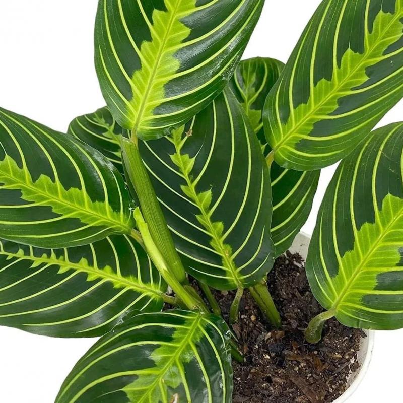 This striking prayer plant features vibrant green leaves with lemon-lime veins and a dramatic midrib pattern. Foliage folds upward at night, adding movement and interest to your space. Perfect for tabletops or shelves in humid, bright rooms.