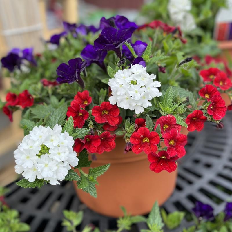 Add instant color to a deck, porch or patio with our combination hanging baskets and patio pots. Each combination brings together several colorful varieties of annuals into a group that packs a punch of intense color.