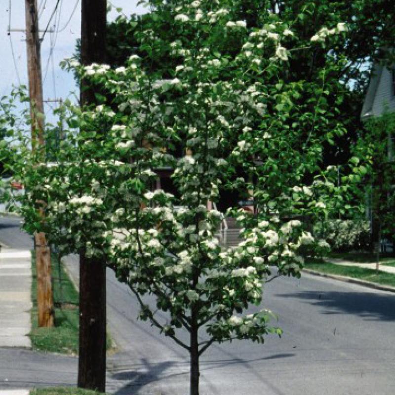 An abundance of white flower clusters appear in late May to June amid shiny, dark green, lobed foliage that creates an open, vase-shaped form with horizontal branching. The scarlet red fall fruits are set off in winter by silver-gray bark.