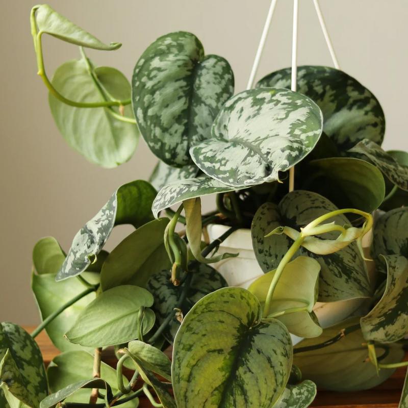 This lush, trailing vine features oversized, velvety green leaves with bold silver variegation that nearly covers the surface. A standout in the Scindapsus family, 'Exotica' adds a touch of jungle drama to shelves, hanging baskets, or tabletop displays.