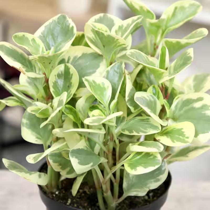 This compact and colorful plant features glossy, variegated leaves in shades of green, cream, and pale yellow with a hint of pink on the stems. Easy to care for and perfect for adding a cheerful splash of color to small spaces.