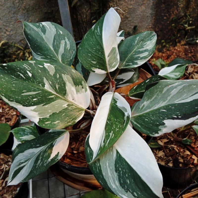 An elegant and sought-after philodendron featuring bold white variegation on deep green leaves and striking burgundy stems. 'White Knight' brings a touch of modern luxury to indoor spaces with its refined, architectural foliage.