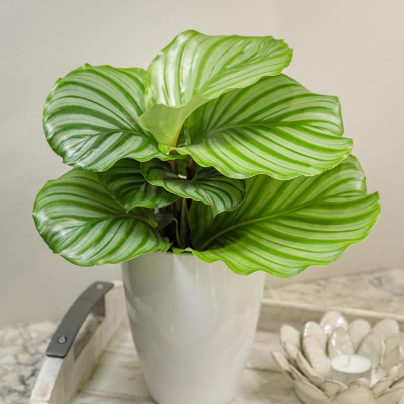 Calathea are grown for their beautifully ornamental leaves. Orbifolia's leaves can get quite large, and are green with silvery-green stripes throughout.