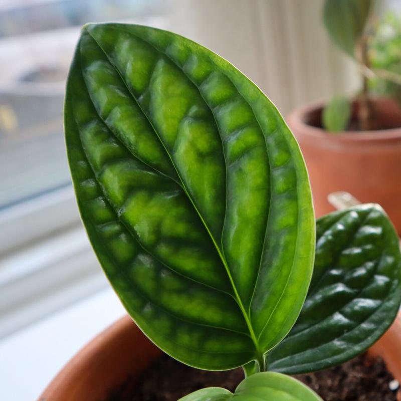 This compact Monstera features thick, leathery leaves with deep, quilted textures and rich green color. Unlike other Monsteras, it does not produce fenestrations. A slow climber, ideal for moss poles or shelves in bright indoor spaces.