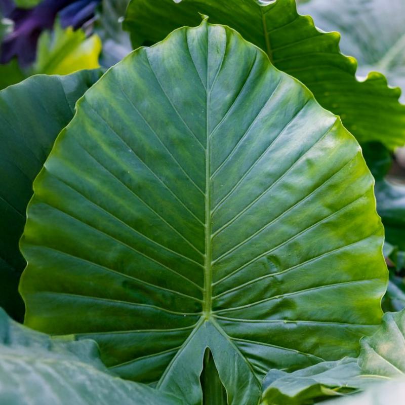 A bold and dramatic hybrid featuring huge, glossy green leaves with prominent veins and wavy edges. ‘Portora’ makes a striking statement indoors or on patios, creating a lush, tropical vibe with its upright growth and architectural form.