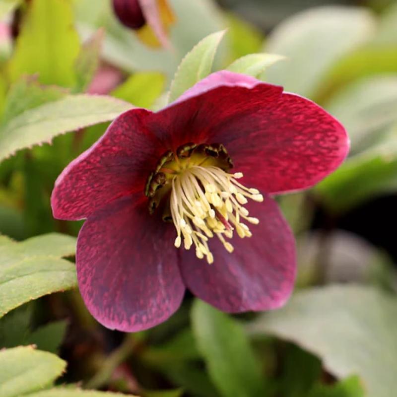 A richly colored hellebore featuring deep wine-red blooms with subtle speckling and velvety shading. Early-season flowers appear from late winter into spring, providing dramatic color in shady borders and woodland gardens. Evergreen foliage offers year-round appeal.
