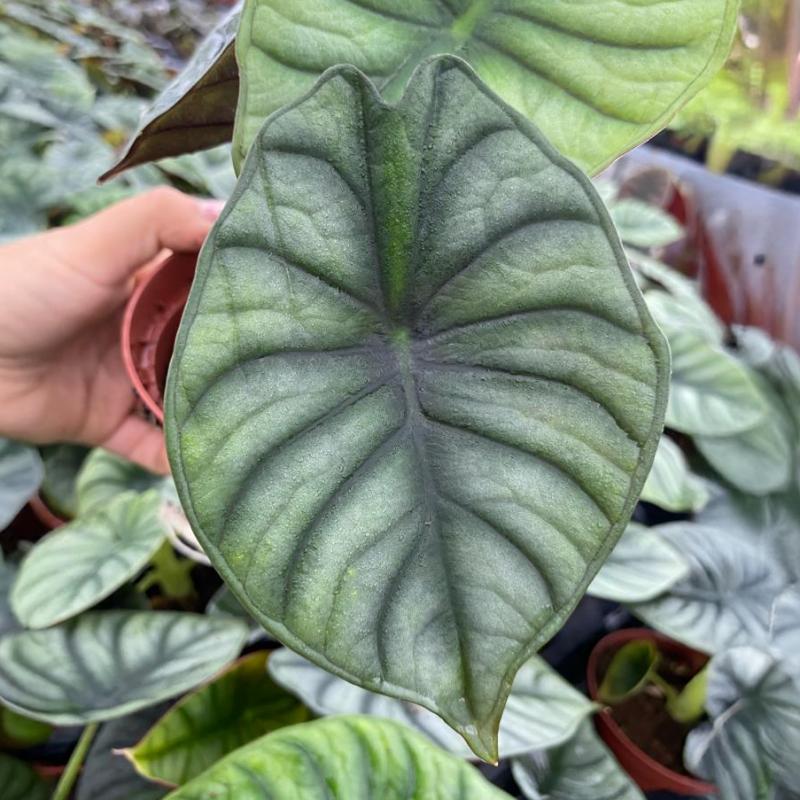 An exotic, highly sought-after Alocasia known for its dramatic, metallic silver-blue foliage and deep veining. ‘Nebula’ thrives in humid indoor spaces and adds a futuristic, sculptural quality to tropical collections.