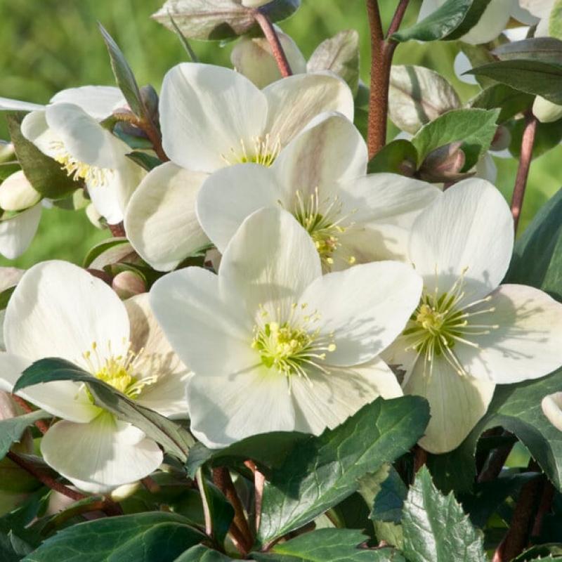 A refined early-spring hellebore featuring large, creamy white flowers that age to soft shades of green and blush. Glossy, evergreen foliage adds structure year-round. A durable, long-blooming selection ideal for shade borders, woodland gardens, and winter interest.