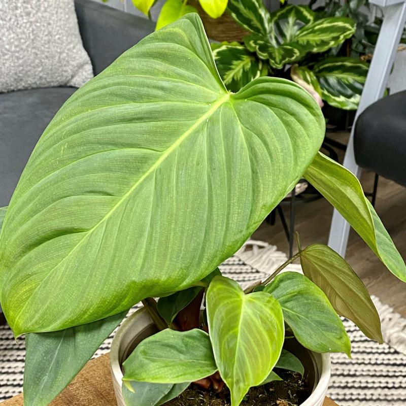 This unique species has beautiful green, heart shaped leaves, but the red petioles with a bumpy texture are the stars of the show. New foliage opens up a bronzish pink and then matures to green.