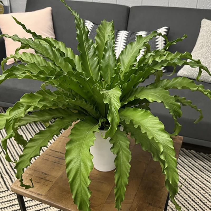 This striking, broad strap-leaved fern has a distinctive shape that some liken to a bird's nest, which is how it got its common name. Glossy, green fronds with uniformly ruffled edges spread upward and outward to form a rosette with a nest-like center.