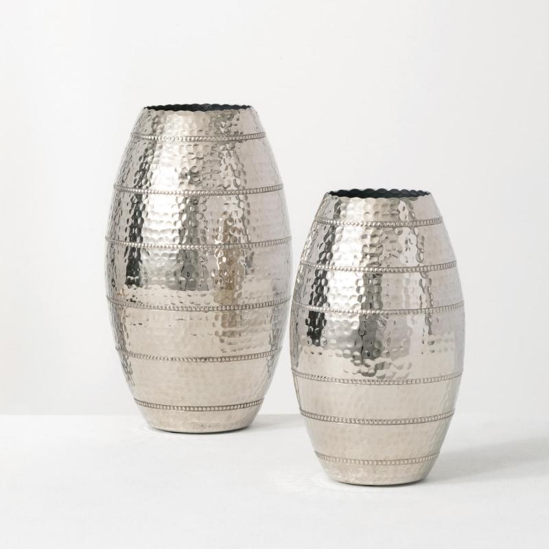 Elegance and sophistication exude from this pair of textured shiny silver vases. Perfect alone or with some faux greenery added, the 10" and 13" height of these pieces fit in anywhere.