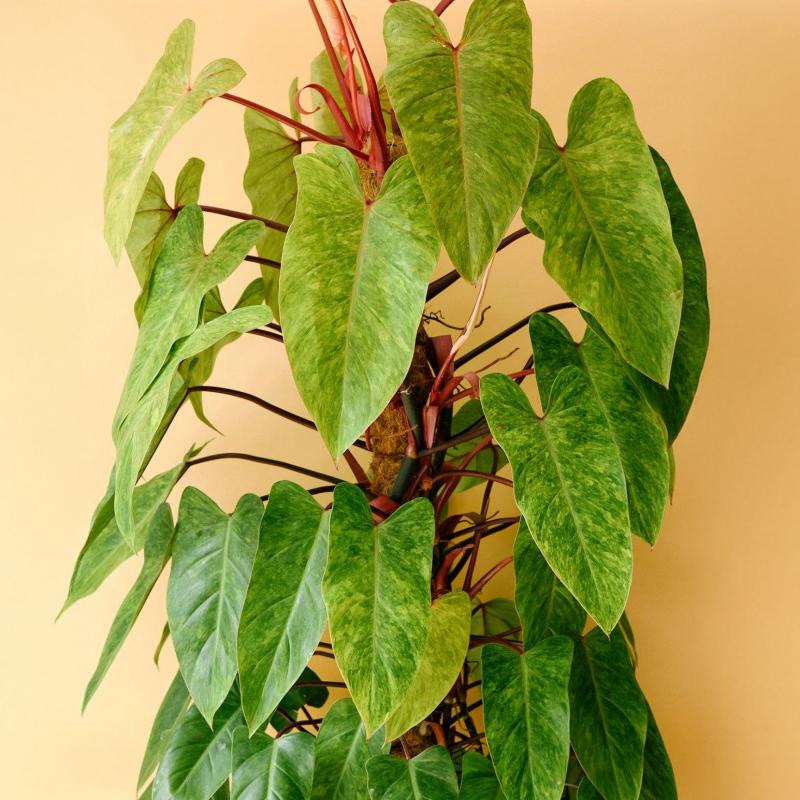 A striking climbing philodendron with lime-green leaves speckled in chartreuse and golden tones, supported by vibrant pink-red stems. As it matures, the foliage deepens in color, creating a stunning layered look.