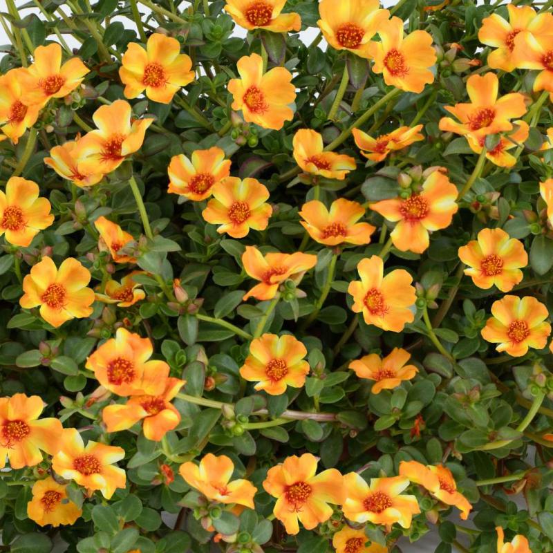 Bright mango-orange blooms with warm golden centers create a cheerful, tropical display. Succulent foliage thrives in heat and drought, producing nonstop color all summer with minimal care.