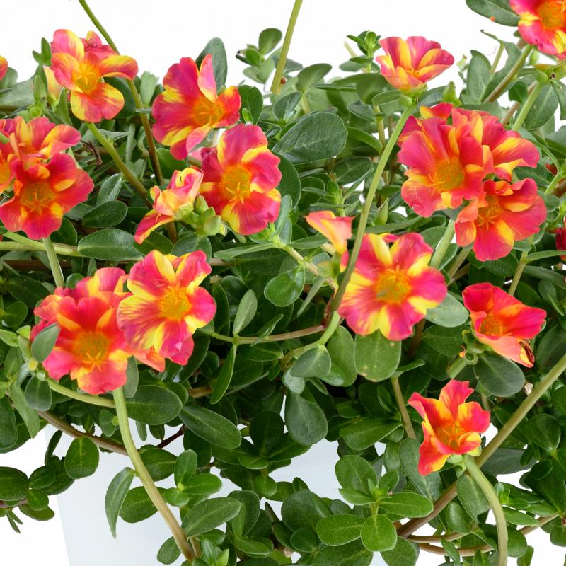 Eye-catching blooms swirl shades of pink, yellow, and coral for a bold, multi-tone “twist” effect. Succulent foliage thrives in heat and drought, producing nonstop color all summer with minimal care.