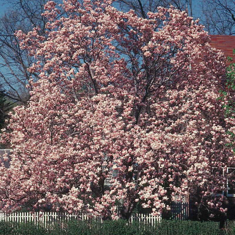 This very popular plant produces an abundance of 5-10" diameter flowers in early spring that are flushed pink-purple on the outside and white inside. Its upright shape as a young plant develops into a multi-stemmed, low branched, small tree.