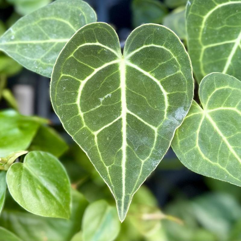 A striking tropical houseplant prized for its velvety, dark green, heart-shaped leaves with bold white veining. Native to Mexico, this slow-growing aroid brings a dramatic, architectural look indoors.