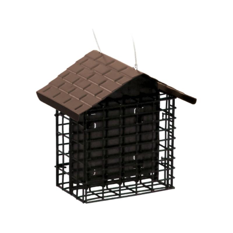 A great way to treat Woodpeckers, Nuthatches, Chickadees, and more! This durable, weather-resistant feeder holds two suet cakes in independent cages with an easy-open, double-locking closure. The shingle-style roof helps keep contents dry by diverting rain and snow, while the grid design is ideal for clinging birds.