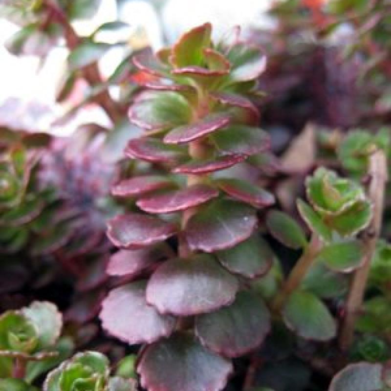 'Blaze' is a very low, mat-forming selection with rounded bronze-green to beet-red leaves and small clusters of ruby star-shaped flowers in August.