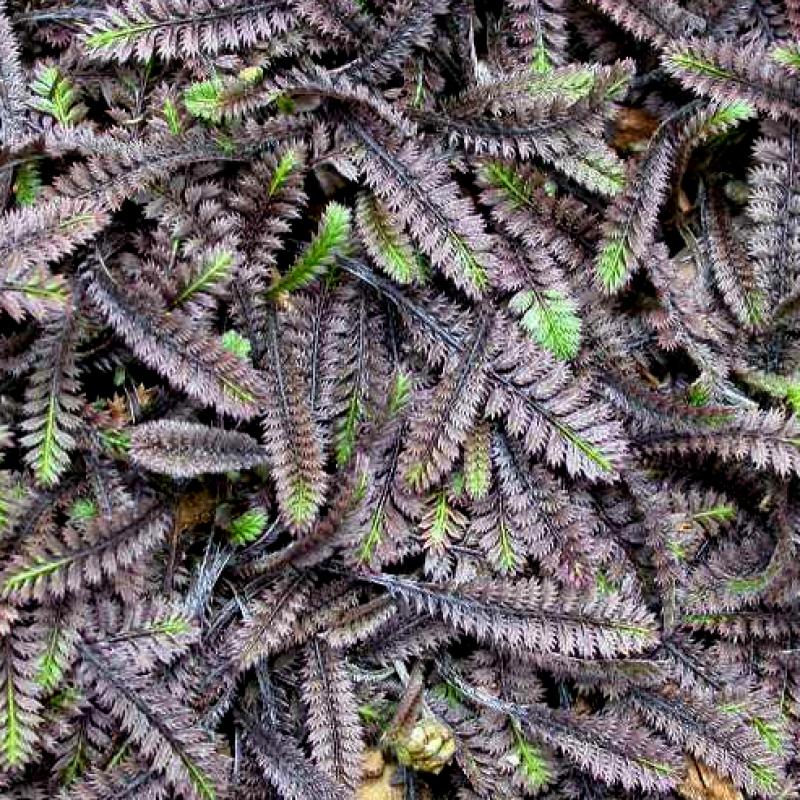 A low, carpeting perennial that is perfect for planting along the edge of pathways, or using in between flagstones. This newer selection features feathery foliage of an unusual bronzy-black shade and bears interesting green flowers during the summer.