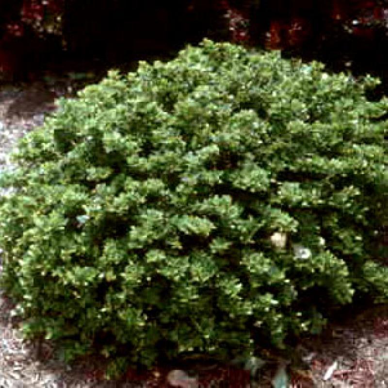 These rounded, spreading yet compact plants feature small, deep green, lightly serrated, evergreen leaves that resemble boxwood.
