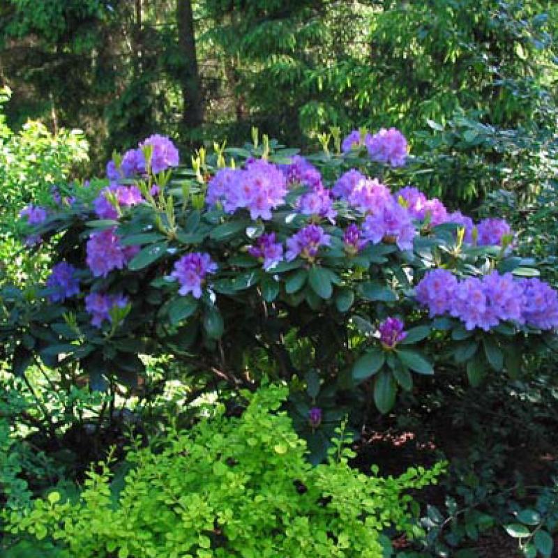 Deep purple-lilac buds open to large trusses of lilac flowers over large, medium green foliage that creates an upright to rounded form.