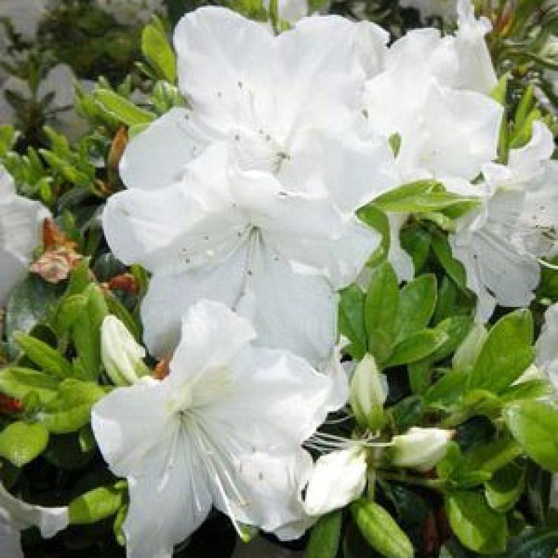 Single, round-edged, white flowers appear in late May over and above the medium green foliage of this variety.