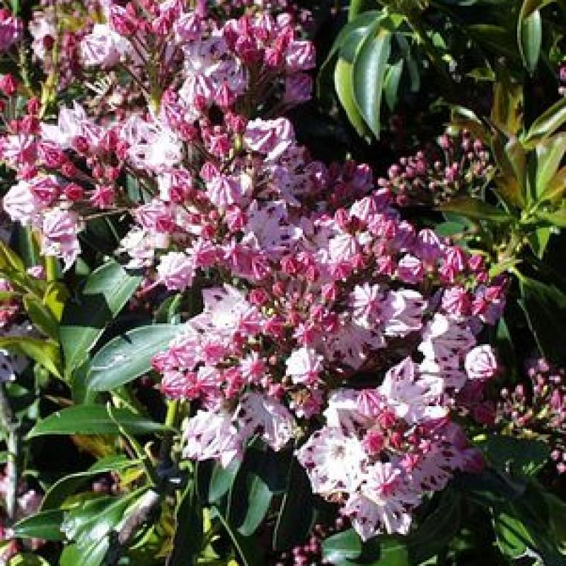 The soft pink buds of 'Carousel' open to purple-cinnamon starburst corollas with edges marked in white over shiny, deep green foliage that is disease resistant.