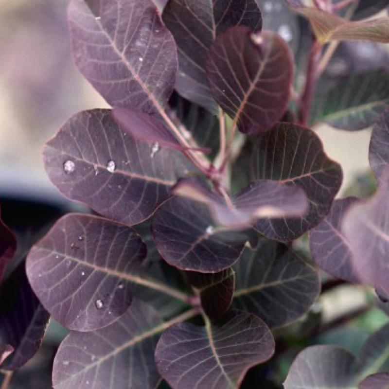 'Royal Purple' produces fluffy, smoke-like panicles of beige flowers tinged with pink that emerge over lustrous velvety foliage that remains dark purple all season. A riot of color including yellow, orange and red takes over in the fall.